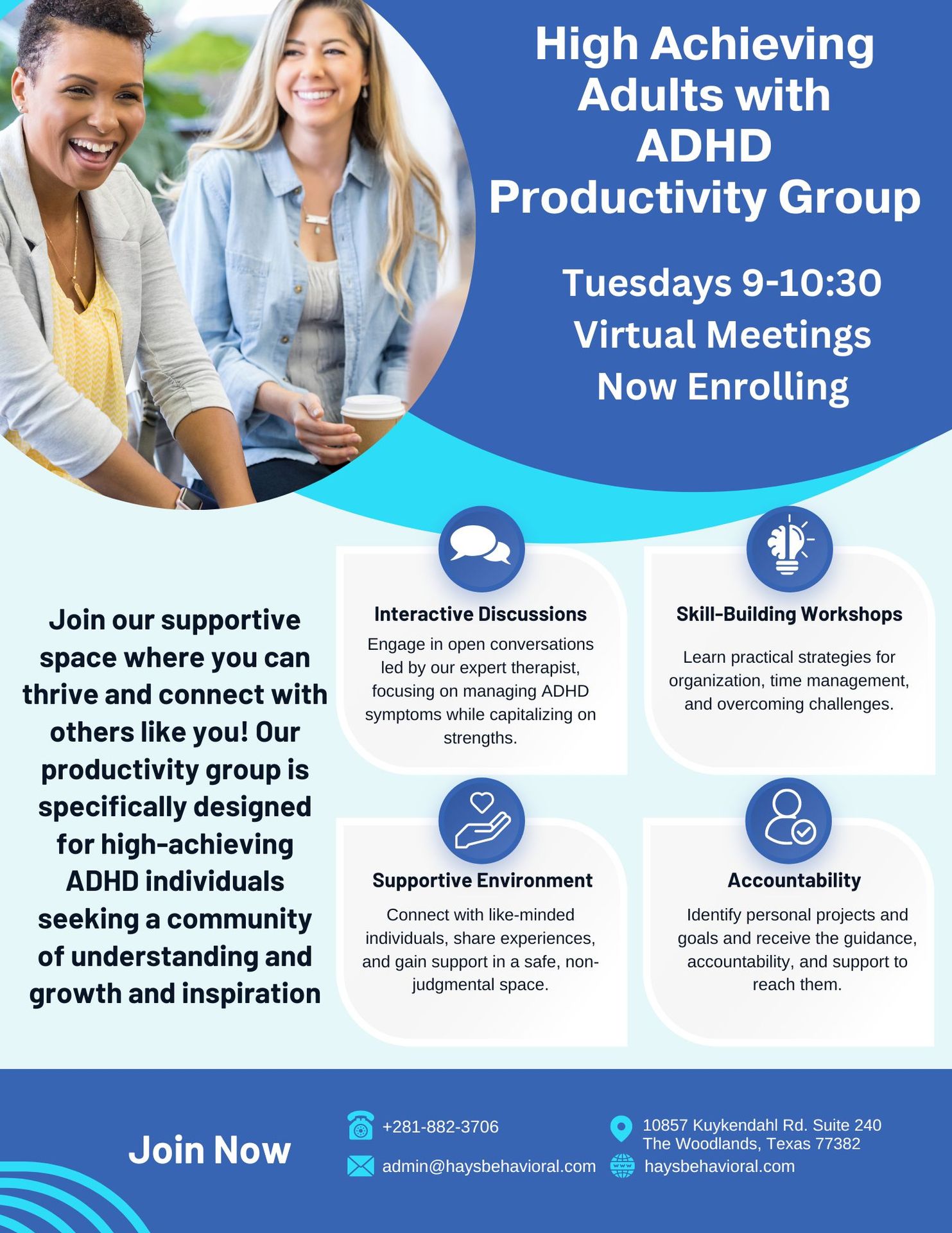 High Achieving Adults with ADHD Productivity Group, s membership community for High Achieving Adults with ADHD. Specifically designed with the unique trials and tribulations those who are high achieving and have ADHD face. Meet others like you in a supportive environment, gain tools to overcome your road blocks, and have the accountability you've been searching for both personally and professionally.